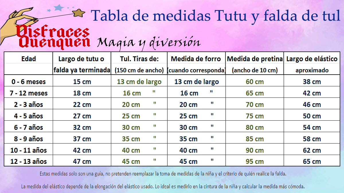 Vamos a comenzar con la tabla de medidas para realizar tutús o faldas de tul siguiendo la técnica que pueden encontrar en los tutoriales de Disfraces Quenquen en YouTube