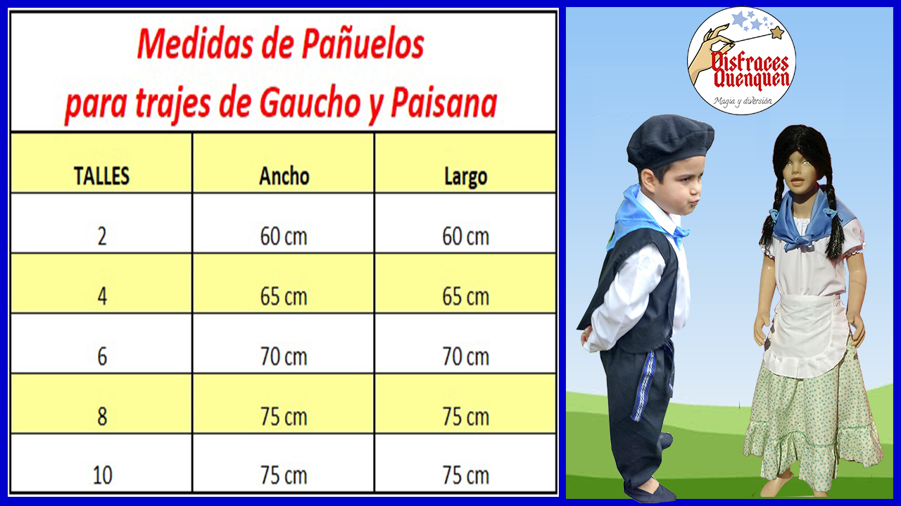 Te comparto las medidas que uso para hacer los pañuelos que completan los trajes de Gaucho y Paisana. Son pañuelos cuadrados que se usan doblados por la mitad en forma triangular.